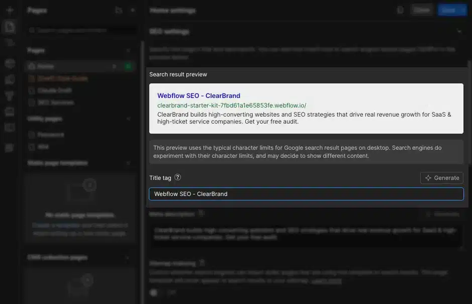 Webflow lets you define a sitewide title template. The format field looks something like [Page Name] | [Site Name]. This applies to any page without a custom title tag set at the page level, so it’s a fallback, not a primary strategy.