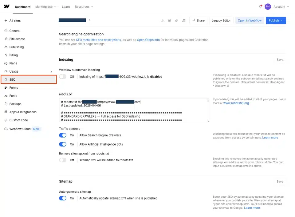 Yes. Webflow auto-generates an XML sitemap so search engines and AI systems can easily find and crawl your pages. It updates automatically when you publish new content. Access it at yourdomain.com/sitemap.xml and submit it to Google Search Console to speed up indexing for new and existing pages.